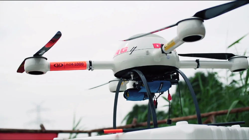 In Germany, the national lifeguard association is working with a local company, Microdrones, to develop a drone specifically for water rescues. The drone could potentially reach a drowning person faster than a lifeguard. The quadcopter drone has a camera that streams live video back to the drone operator and an integrated GPS system. Once it spots a swimmer in distress, a lifeguard on shore activates the drone. The drone flies out to the swimmer and drops a flotation device ensuring the swimmer has some help before the human lifeguard arrives.